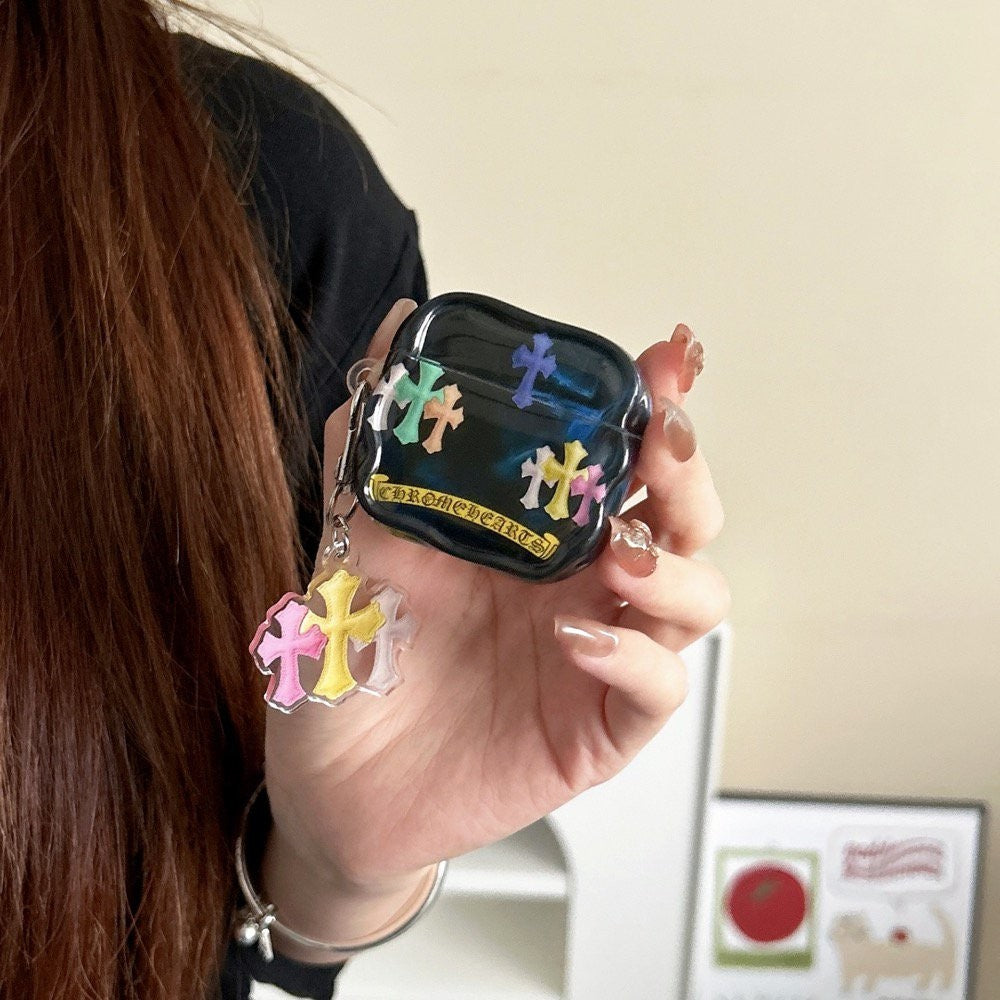 A glossy, chrome-inspired AirPods case covered in colourful cross detailing. Each colourway comes with its own style: one features pastel crosses with a soft-tone charm, while the other has brighter multi-cross graphics with a matching bold charm. Both bring that luxe streetwear edge while keeping your AirPods protected.